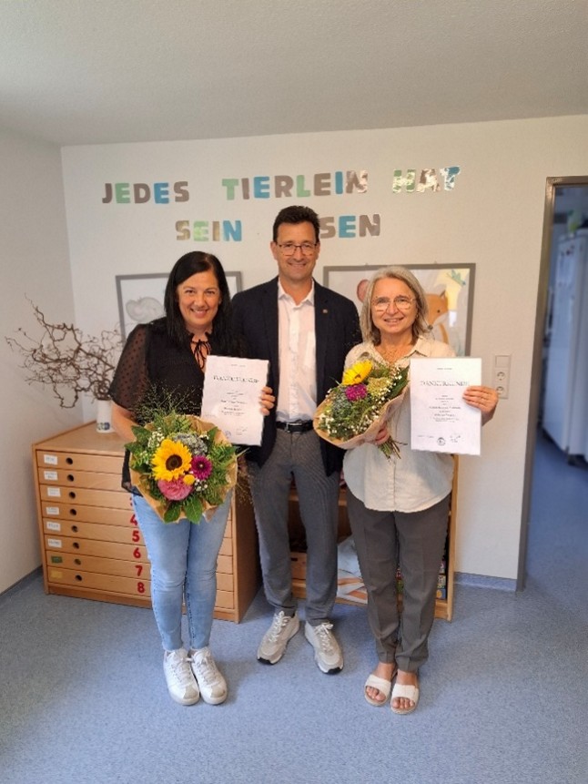 Bürgermeister Timo Wolf überbrachte den Jubilarinnen die Glückwünsche, verbunden mit einem Blumenstrauß nebst Urkunde und dankte ihnen für die langjährige Treue und den unermüdlichen Einsatz. Die Gemeinde freut sich auf viele weitere Jahre der Zusammenarbeit im Dienst für unsere Kleinsten.