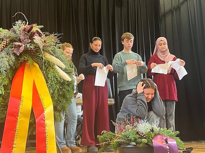 Die Wolf-von-Gemmingen-Schule bereicherte die Gedenkfeier mit einem eindrucksvollen Theaterstück der 9. Klasse unter dem Titel „Ich KRIEG diesen Traum nicht los“. Musikalisch begleitet wurde die Veranstaltung vom Posaunenchor gemeinsam mit Musikern der Blaskapelle Gemmingen.